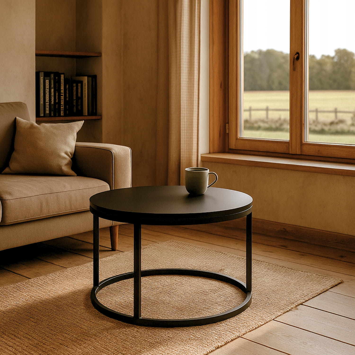 Stolik kawowy Yuo – okrągły blat w kolorze beżowym i czarna rama. Prosty, elegancki i praktyczny mebel, który dopasuje się do różnych aranżacji.