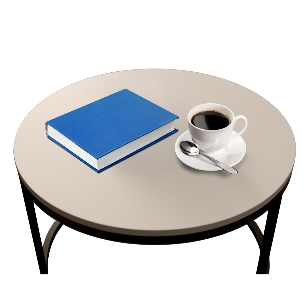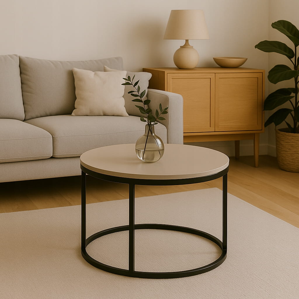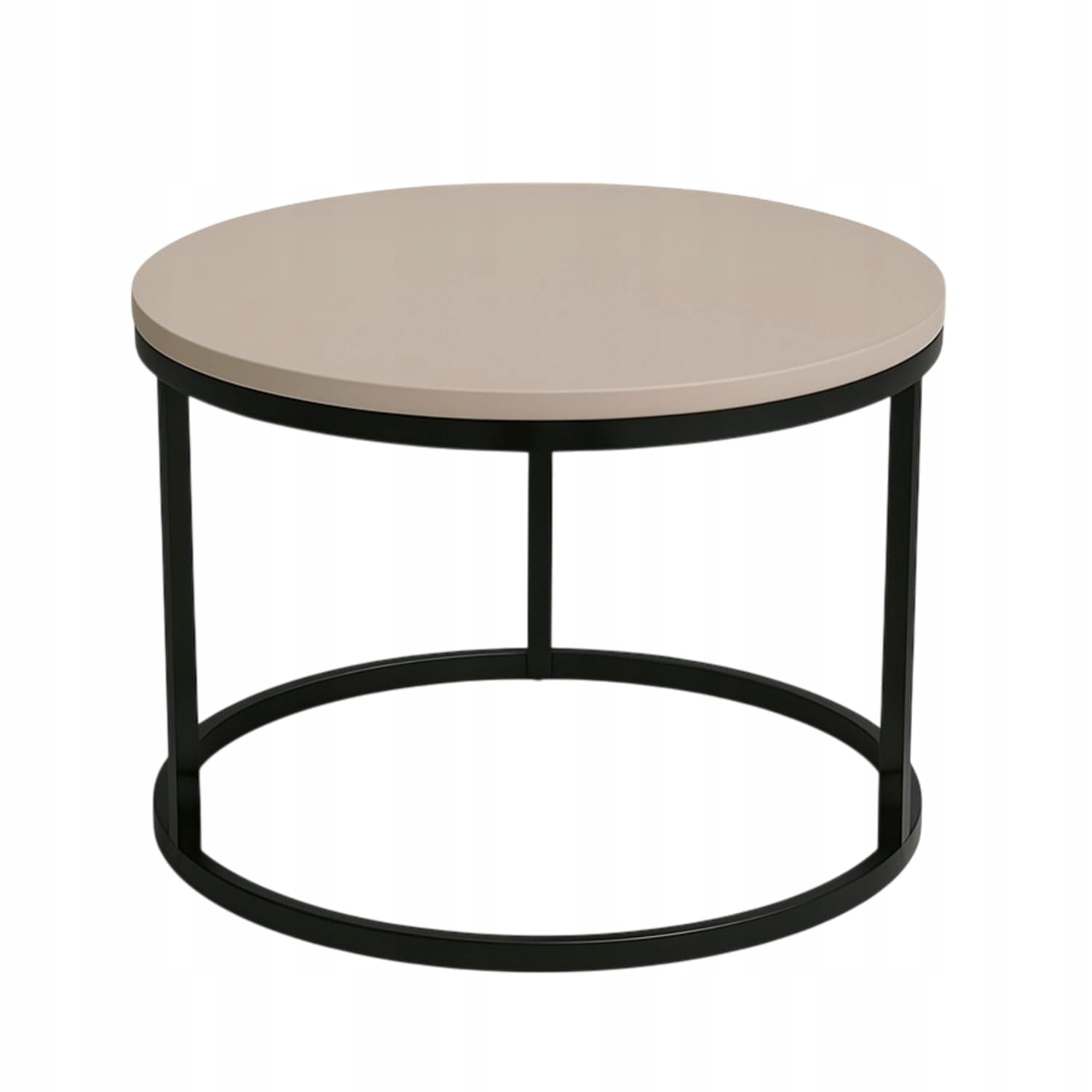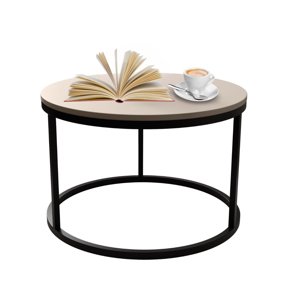 Stolik kawowy Yuo – okrągły blat w kolorze beżowym i czarna rama. Prosty, elegancki i praktyczny mebel, który dopasuje się do różnych aranżacji.