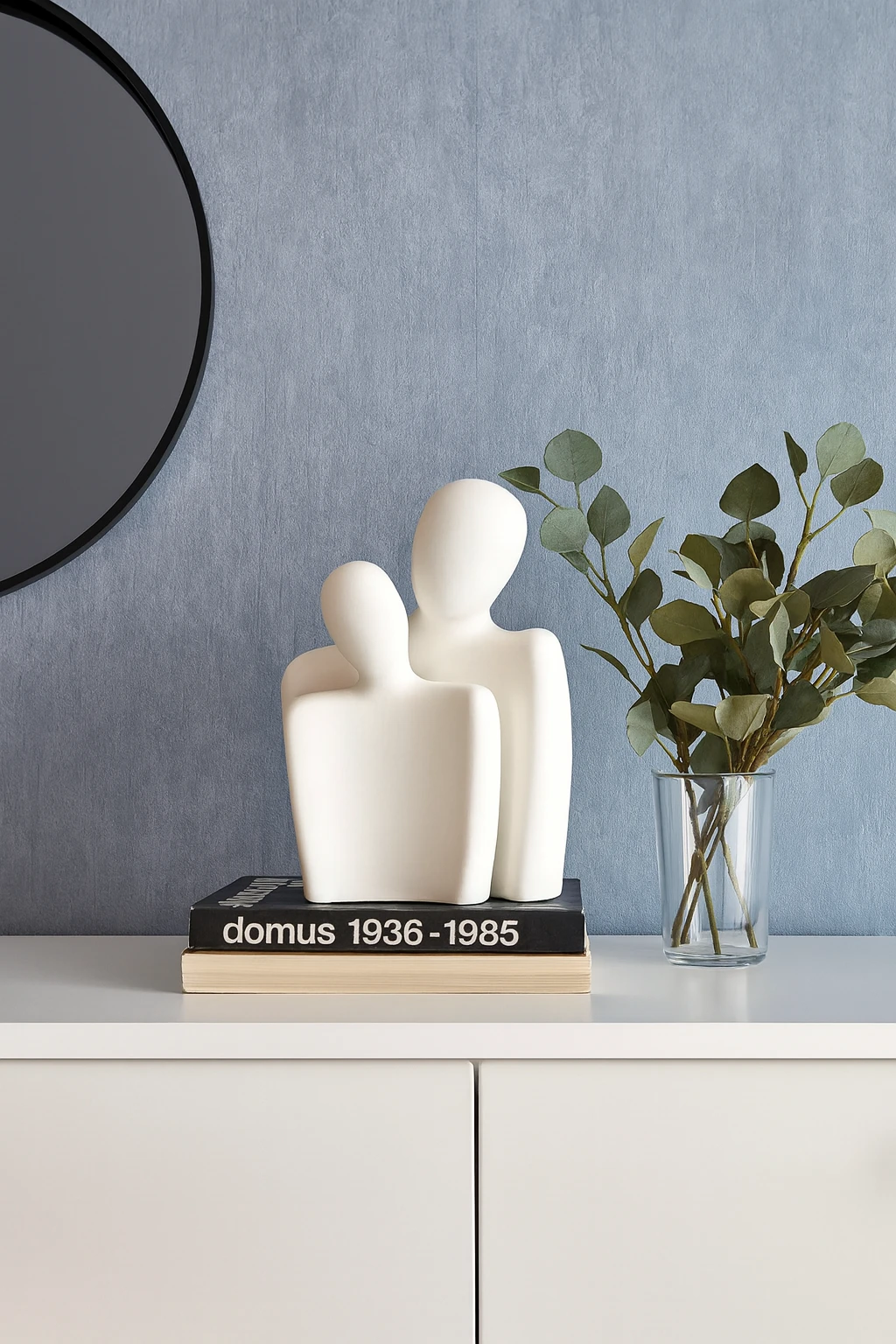 Zestaw składa się z dwóch rzeźb o wysokościach 20 cm i 26 cm, które najlepiej prezentują się ustawione blisko siebie, tworząc kompozycję pełną dynamiki i ciepła. Duo Harmony to doskonała dekoracja do sypialni, gdzie podkreśli intymny charakter wnętrza, lub do salonu, w którym stanie się symbolem rodzinnych więzi. Dzięki matowej bieli, figurki świetnie rozświetlają regały biblioteczne oraz biurka w gabinetach.